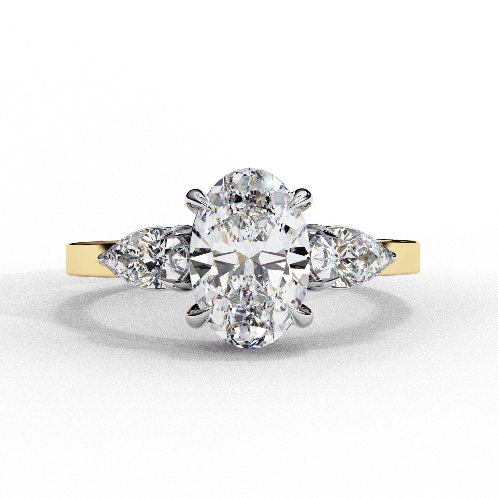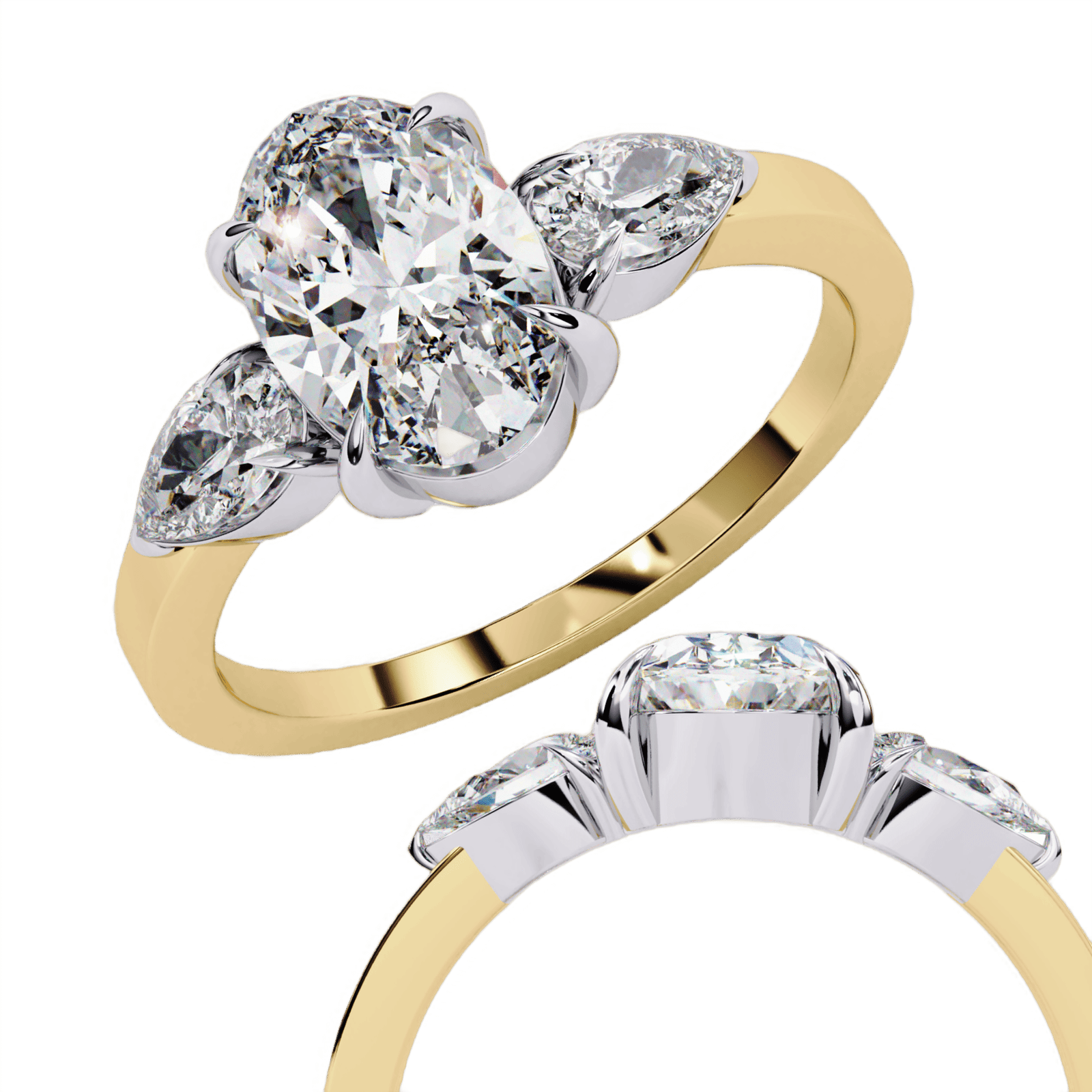 1.5 Carat Oval Diamond Three Stone Ring | 18K Two-Tone Gold Engagement Ring with Pear Side Stones | Trilogy Anniversary Gift