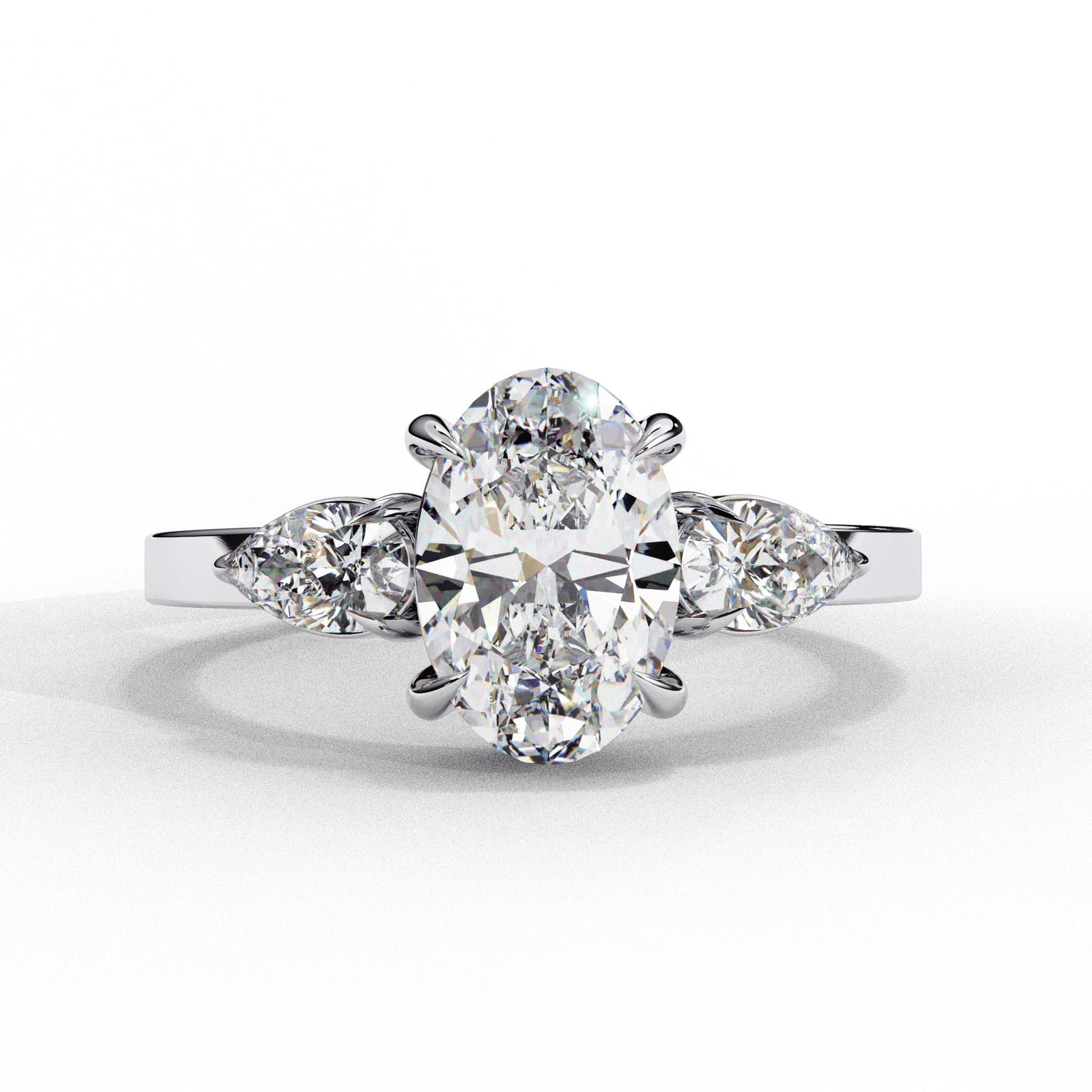 At its heart is a magnificent 1.22-carat oval-cut diamond, celebrated for its incredible fire and elegant, elongated shape. It is perfectly flanked by two sparkling pear-shaped diamonds, bringing the total carat weight to an impressive 1.54 carats. This classic “trilogy” design is not just a piece of jewelry; it’s a narrative of your unique love story, destined to become a cherished heirloom.